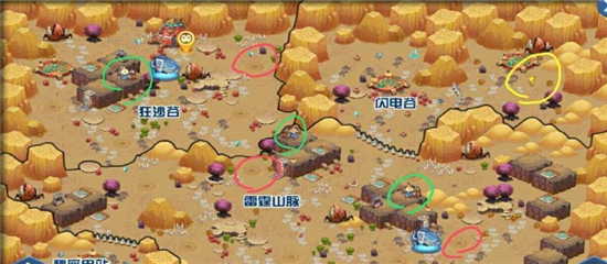 1、如下图所示,地图上的重点部分用各种颜色圈了出来,其中绿色代表发电机位置,黄色代表雷伊所在位置,而要想到达雷伊的位置就需要激活发电机,红色是可以进入的流沙位置。