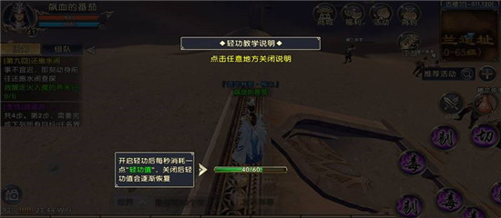 2、轻功操作、施展轻功的按钮在右边技能键的左边,平常作为跳跃功能存在。若是长按改按钮即可开启或关闭轻功功能,开启后再次点击跳跃即可施展轻功直接跃向空中。轻功一共有四个阶段,每提升一个阶段即可在空中多进行一次跳跃,在后期游戏中可以通过任务习得。轻功开启后每秒消耗一点“轻功值”,关闭后轻功值会逐渐恢复。