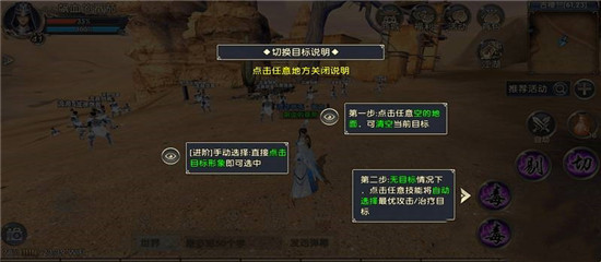 7、切换目标、在野外面对不同野怪或者进行采集的时候如何进行不同目标间的选择呢?一种是点击任意空的地面,角色就会自动攻击清空当前目标。还有一种是在无目标的情况下,点击任意技能将自动选择最优攻击或治疗目标。当然你也可以进行手动选择:直接点击目标形象即可选中。