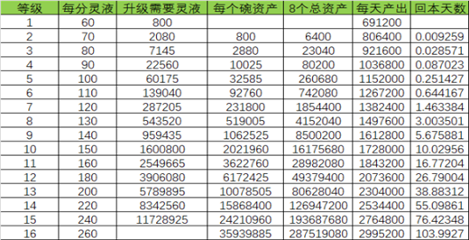 再来看看这一份数据表。说明一下,洞府一共是8个碗,然后每个碗根据不同的等级需要的升级碗本身的灵液也不同。那么这里面每个碗的资产这个值就相当于把一个碗升级到不同等级累计花掉的灵液值。距离说一下,比如碗从1级升级到7级,那么就一共需要231800灵液值,也就是说一个7级碗本身就价值213800灵液,根据每天产出的灵液值1382400计算的7级碗回本大概需要1.46天时间。