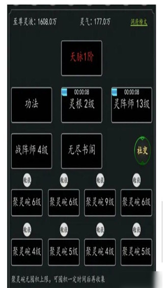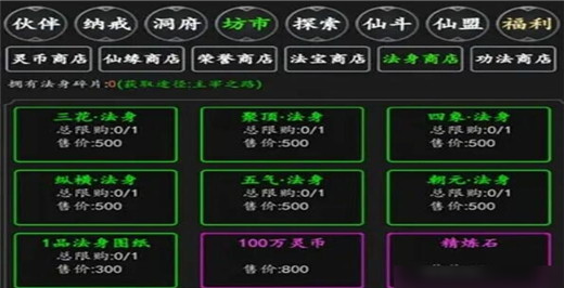 洞府:前期要特别留意,手动开启并及时提升。升级顺序建议:人脉、聚灵碗、战阵师、灵根、灵阵师。多余的伙伴可以放到战阵师,等有了足够资源再进行培养,战阵师的伙伴会提供一定比例的附加属性加成。无尽书阁:炼器化丹的地方,开启后可以升级并进行炼丹炼器,各类型装备法宝丹药都可以从这里产出。