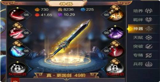 并且8~10资质的武将几乎不需要花费什么心思就能轻易的齐集,一些神器的全体属性激活后不需要该名武将上阵也能提高所有武将的属性,实用性和性价比都很高。