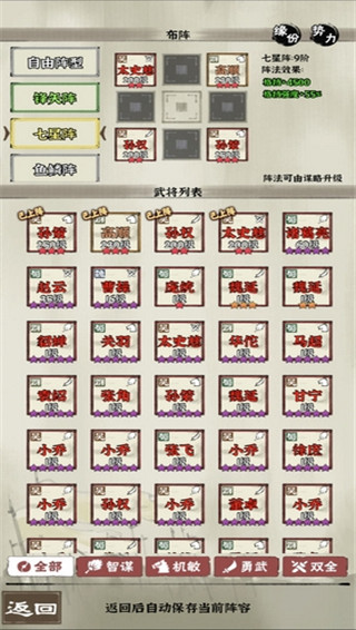 以上就是格挡阵的原理和需要注意的地方。因为太史慈属于稀有武将,如果前期没出,可以用甘宁代替,如果有诸葛亮,可以使用比较经典的,高顺,孙权,孙策,诸葛亮,卢植。切记,格挡阵的终极形态一定是:高顺,孙策,孙权,太史慈。