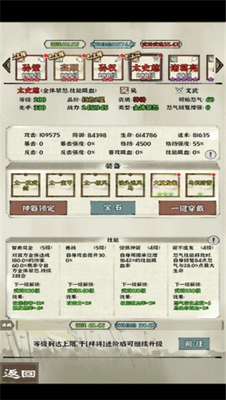 神器升级:只需要升级孙策的神器,两个神器平均升。小技巧:神器每五星增加触发概率,所以神器也是升五级再轮换下个神器。