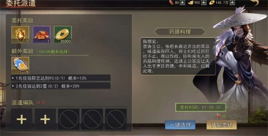 主公点击任意委托将会打开委托详情,可直观查看委托奖励、委托条件、派遣时间、派遣消耗等等。其中,委托奖励是,主公派遣指定数量的佳丽且完成任务后即可获得。而额外奖励则是完成委托后较低几率获取,若能达成委托条件,可增加获取额外奖励的几率。