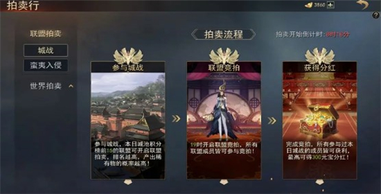 联盟拍卖开始时,系统会根据城池积分排名分配拍卖道具,排名越高的联盟获得的拍卖物品更多。只有本联盟的成员才可以参与联盟拍卖。