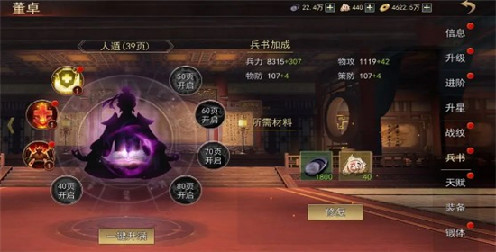 4、兵书修复达到20、30、40、50、60、70、80页时需要消耗兵书残页进行突破,突破后会额外激活一个兵书技能