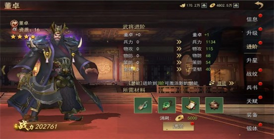 3、武将进阶需要消耗进阶材料和铜钱