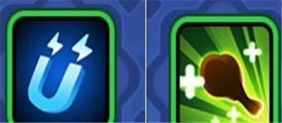 4、初始技能选择:输出推荐带磁铁,前期能够保证输出的等级发育,更早的选择技能,技能的加成至关重要,在操作相同的情况下,具有更多技能搭配的会有更大的优势,并且在作战当中能够凭借磁铁的范围吸收效果,有利于吃到击杀敌人所掉落的蘑菇;辅助推荐携带投掷鸡腿来帮助输出保持血量的安全
