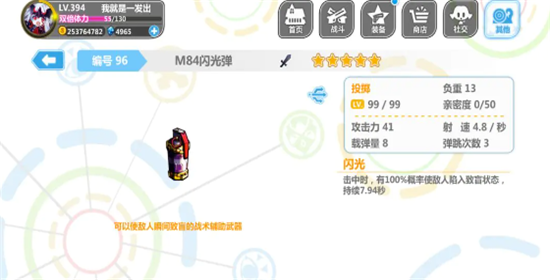 闪光弹本身具有的攻击力极低,并且覆盖范围极广,只要在屏幕范围内都会被致盲效果所影响,即使玩家使用奏冥曲来提升伤害,也可以在攻击范围之外致盲敌人。闪光弹获取方式极其简单,虽然可以通过剧情关卡获取,但是在祈愿中同样可以获取,是祈愿里的常驻普通装备,并且现在闪光弹获取几率已经比之前提高了很多,只要小伙伴不随意卖出装备,相信很多人都会有这件装备的。