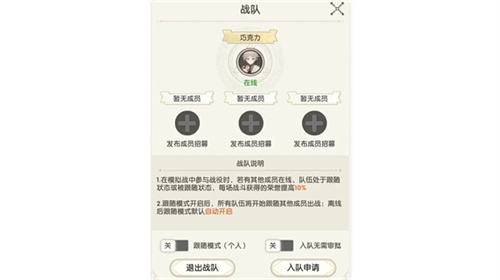 单独作战,指自己的队伍发起的进攻。自己最多可以安排3支队伍,队伍支持 [编队] 和 [解散]。