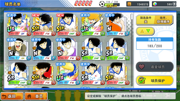 在球员名单中各位队长可以查看自己所拥有的所有卡牌,同时可以对稀有球员进行“球员保护”操作,点击右下角球员保护后可以选择需要保护的卡牌,所有被保护的卡牌均会出现小锁的标识,保护中的卡牌不能被出售,或用于强化材料等。(最爱球员功能类似于球员保护)这样可以避免因为失误操作造成珍惜卡牌的损失。