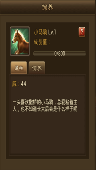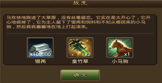 来看看小马驹初始属性,小马驹在成为名驹前不能放生,成为名驹后可以通过升级来提升战力,也可以放生获得银两,有概率获得饲料和小马驹。