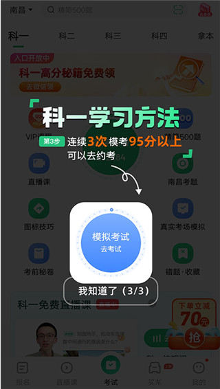 4、等我们刷完一整套题,我们就来模拟考试,模拟考试根据考试标准随机出题,并且和正式考试一样,有时间限制,总题100道。模拟考试开始,我们就可以按照考试标准答题了,记住,三次95分以上就可以去约考科一。