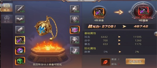 装备狂化系统,拥有4阶装备后开启,装备狂化可以大幅度提高装备属性并且改变装备颜色同时附带属性。