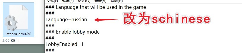 用记事本的方式打开,找到Language那一栏,把russian改成schinese,进入游戏后就是中文了。