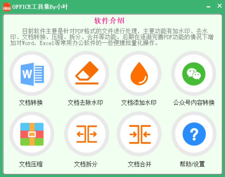 其实这款 Office 工具集不如叫 PDF 工具集更合适一点,因为所有功能基本围绕 PDF 展开,目前作者只发布了 1.0 版本,期待作者的新版本能够更完善!