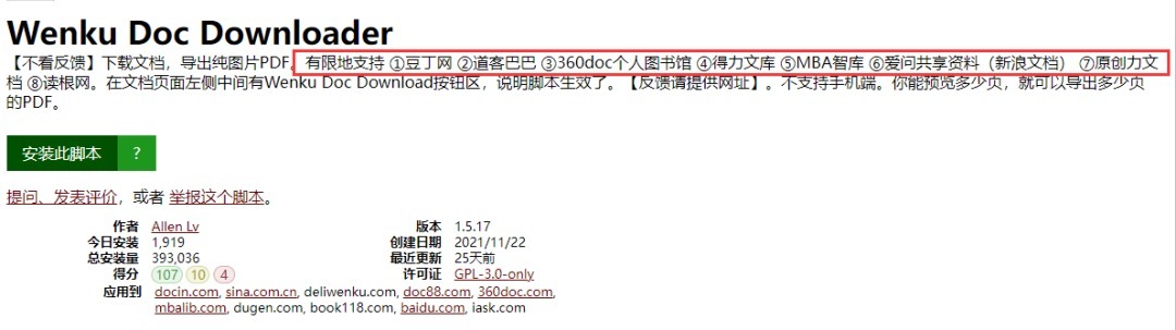 这样就导致我们之前分享过的一款非常强大的油猴脚本Wenku Doc Downloader(可点击跳转)完全失效,当然除了百度文库之外,像豆丁网、道客巴巴等等仍然能够继续支持。