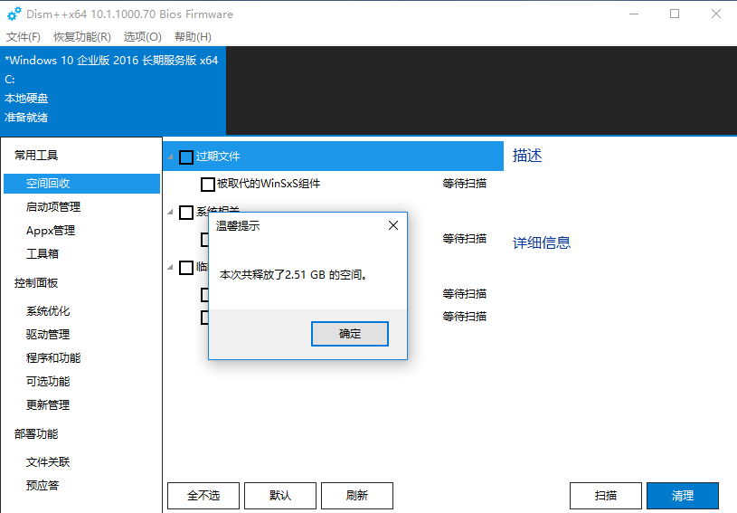 有空间回收、更新清理、系统优化、CompactOS、Windows Update、完整ESD支持、ESD转ISO、WIM/ESD互转,Imagex、ISO生成器、引导修复、系统备份、系统还原、春哥附体、驱动管理等,兼容 Vista/7/8/8.1/10平台。