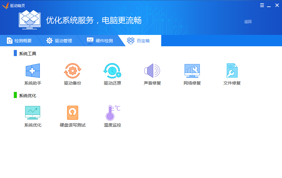 此外还提供了系统设备状态检测、设备故障处理、硬件相关问题修复等功能。 通过使用,用户可以方便的在安装操作系统后,快速的为电脑硬件安装驱动。由于驱动精灵具备丰富的驱动库,提供对品牌笔记本、台式机的专用支持。所以各类电脑用户都可以通过它获得专用的程序,更能够获得适合自己机型设备的各种特色专用软件,如:快捷键、触控板、指纹识别、电源管理、硬盘保护、显卡切换、专用控制面板等。