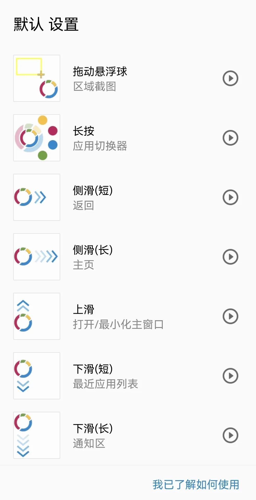 开启 FV 悬浮球的辅助功能,需要手机设置中打开“无障碍”。软件默认的上滑打开/最小化窗口,侧滑可返回主页,长按可快捷切换应用,拖动悬浮球区域截图等等。