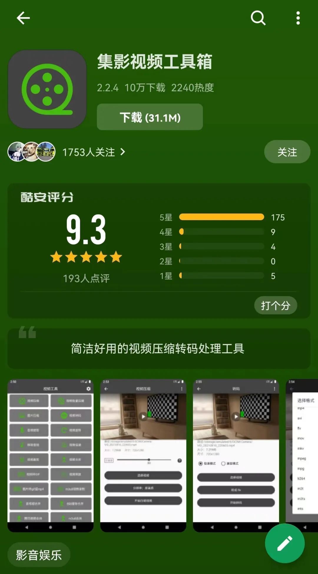 第二款安利的是集影视频工具箱,相比第一款酷安下载量只有区区的 10 万,评分是 9.3 分,但依然是一款非常不错的集合工具箱。