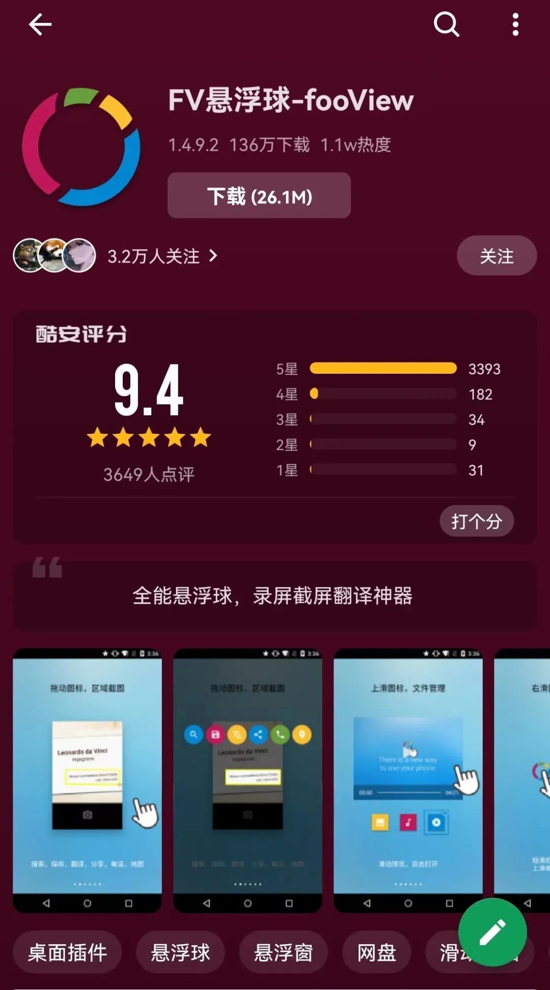 第一款是 FV 悬浮球-fooView,酷安上9.4 评分,136 万下载,是一个全能的悬浮球。