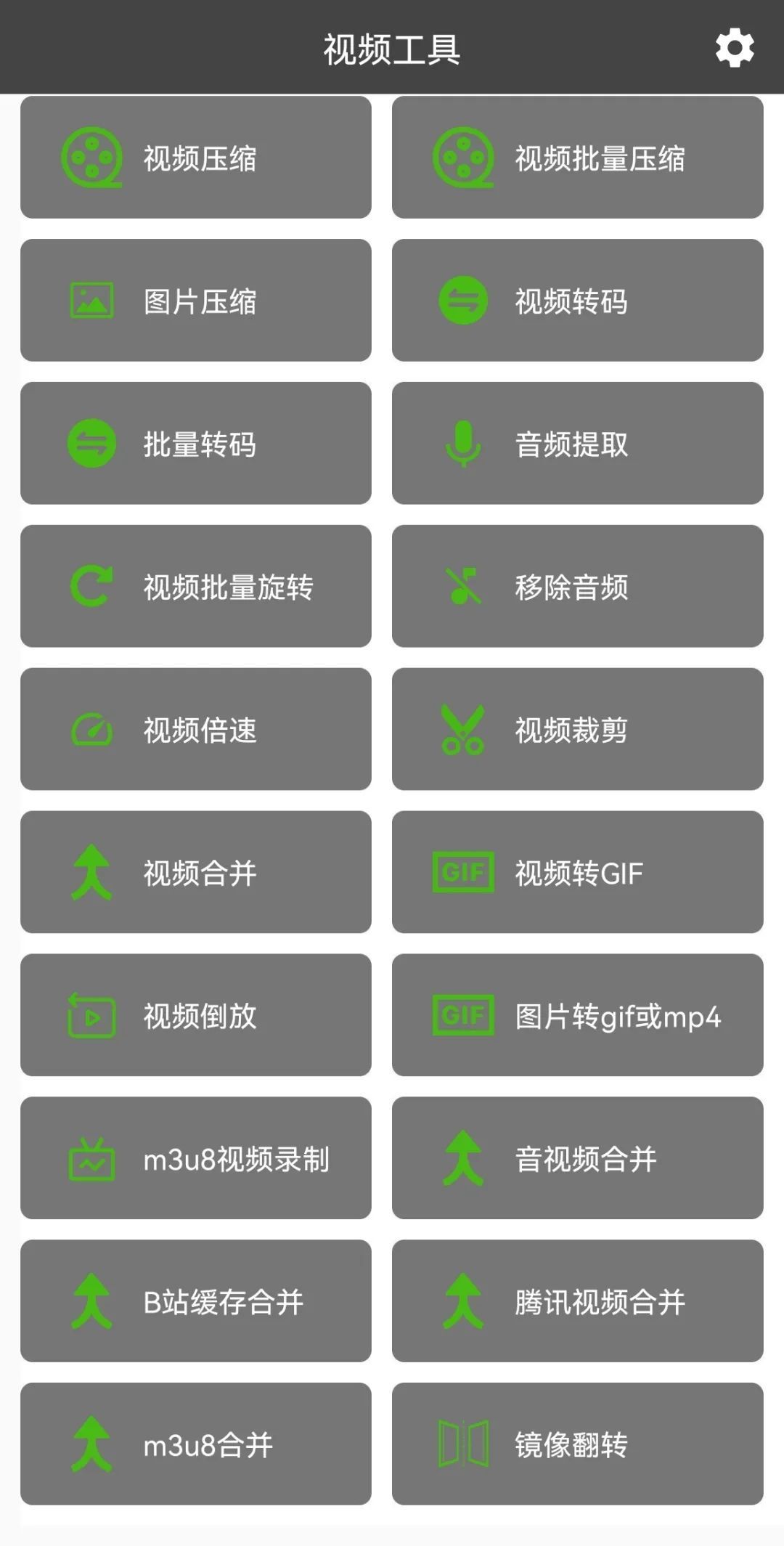 集影工具箱目前多达 20 种功能,包括视频压缩、图片压缩、视频转码、音频提取、移除音频、视频倍速、音视频合并、视频转 GIF、视频倒放、图片转 GIF 或者 mp4、m3u8 视频录制、音视频合并等功能。