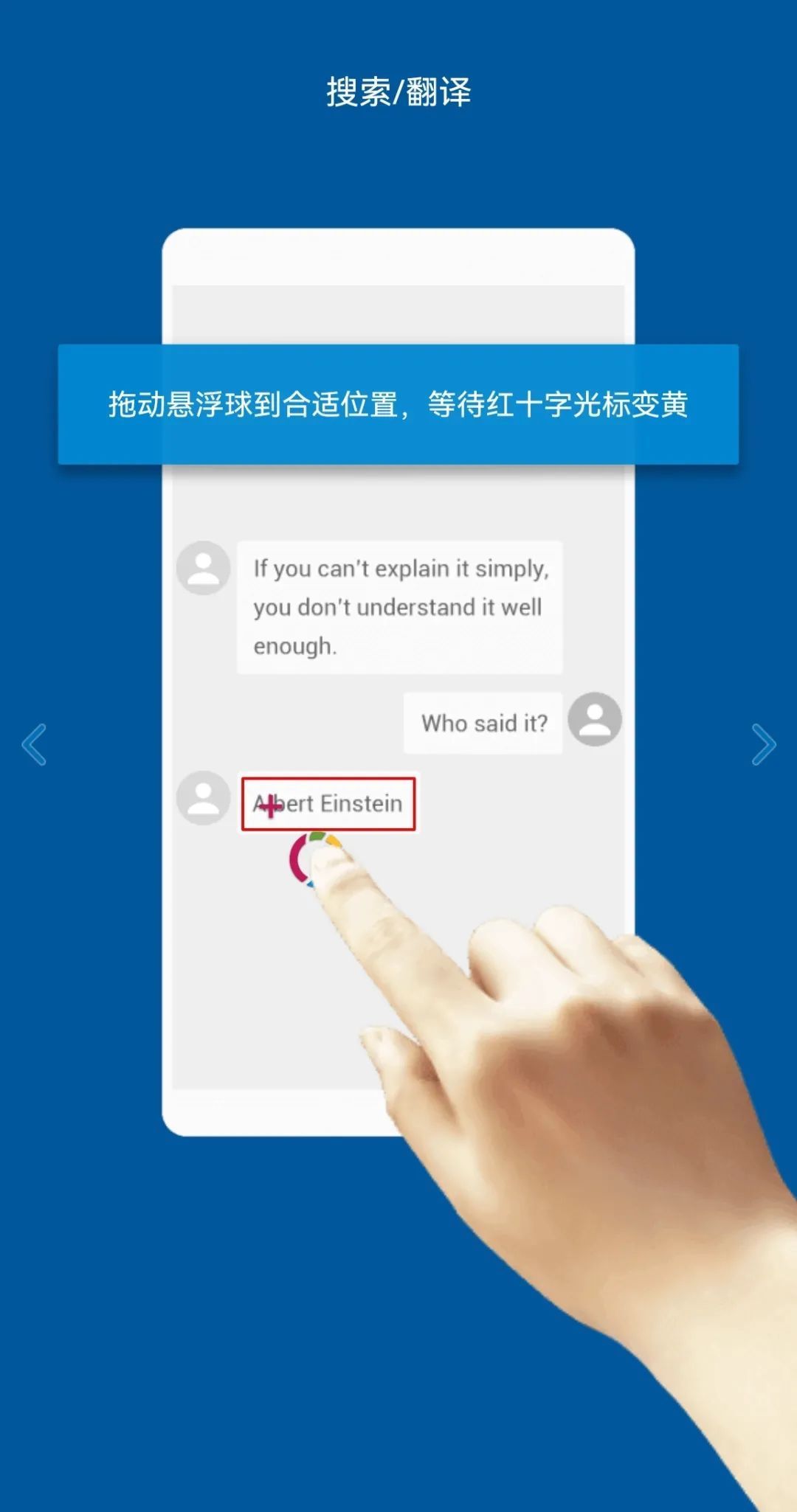 拖动悬浮球到合适位置,等待红十字光标变黄,就可以开启「智能 OCR 文字识别+智能翻译+智能搜索」等功能。