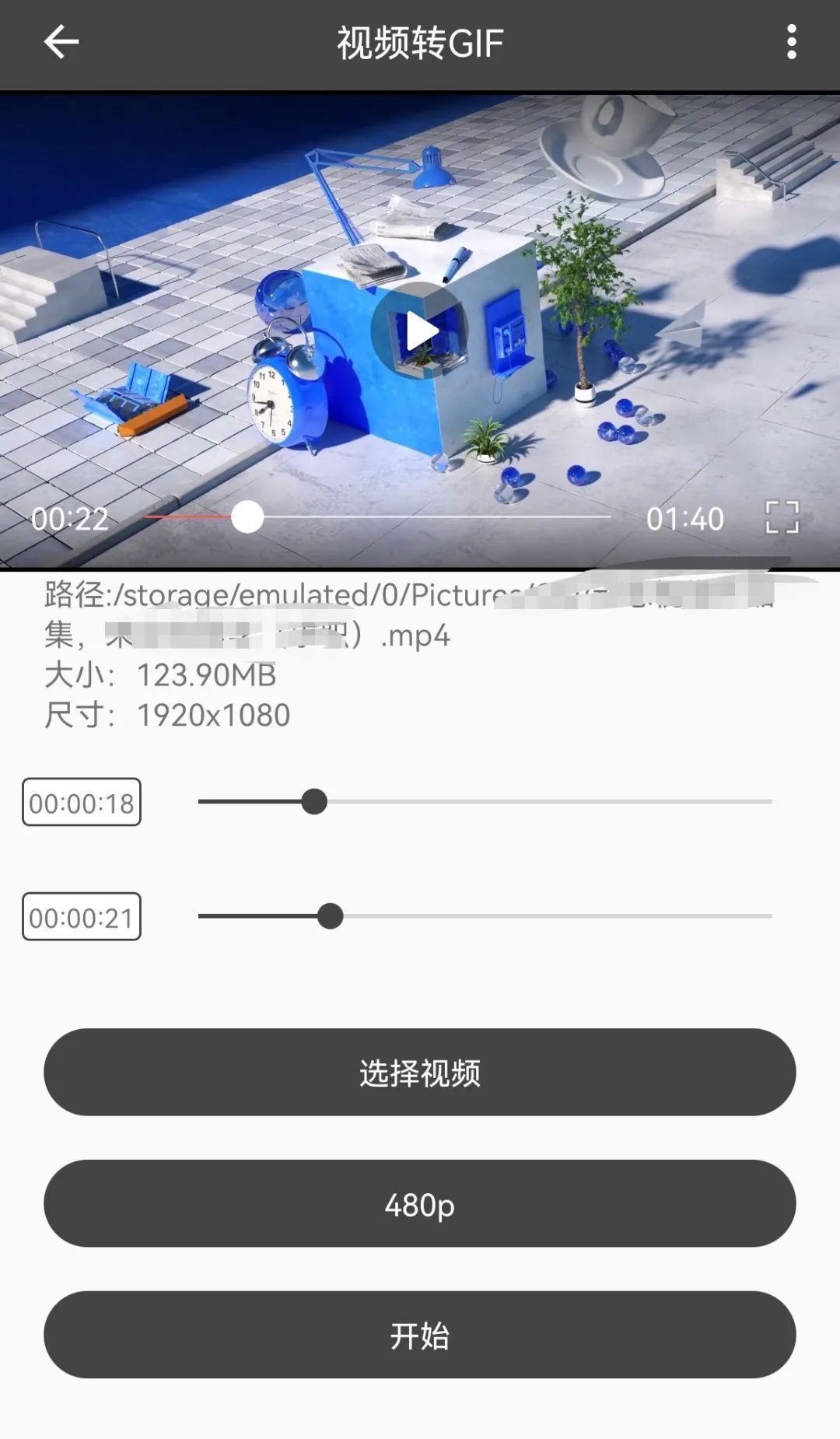 再比如视频转 GIF 功能,直接选择视频加载,然后选择转成 GIF 动态的时间段,点击开始即可。