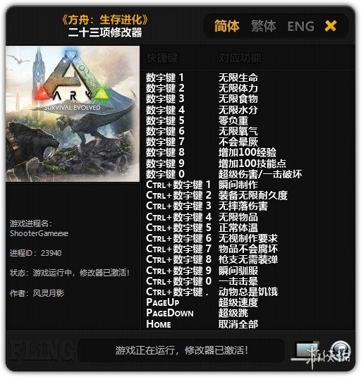 方舟生存进化修改器风灵月影版-方舟生存进化二十三项修改器下载 v1.0