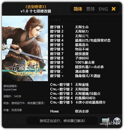 古剑奇谭3十七项修改器是针对同名游戏研发出来的一款游戏数据修改工具,对于这款游戏玩过单机的小伙伴应该都知道,从游戏刚发行到现在一直处于热门的状态,小编没事的时候也会玩玩。不过有时候正常玩这个游戏的时候也会感觉到无聊,因此小编为大家收集到了这款古剑奇谭3十七项修改器,这个修改器可以完美的修改该游戏里面的很多数据,大家应该也知道,单机是不需要连网的,因此有修改器是可以达到修改游戏数据的目的。有了这个修改器,你可以拥有无限生命、无限耐力、无限金币、无限经验、无限星魄/技能点,以及拥有最高的抗性(免疫异常状态)等各种变态属性,可以说达到了无敌的状态,玩起来非常的爽。