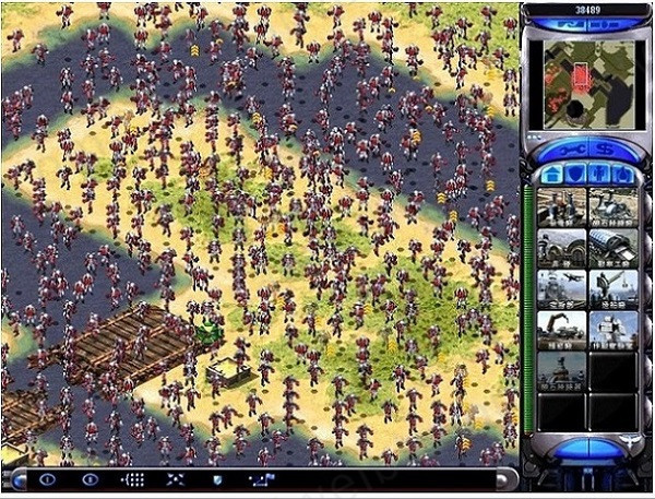 第五招、抢,造30辆矿车采矿,由于它的行动迅速,采矿速度也很快,所以我常用来“抢矿”,什么是抢矿呢?就是命令自己的矿车先去采敌占区附近的矿石,等几个敌占区的矿石都被我的矿车采完了,我才采我军基地附近的矿石。这样,一方面可以为自己赚更多的Money,另一方面,如果敌方不够Money做防守了,我方就可以很容易地将敌方击垮。