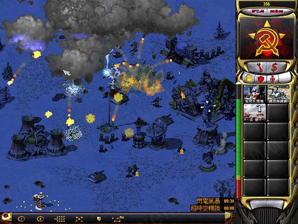 第三招,也是我第一的必杀技——灰飞烟灭,先等待闪电风暴和核弹攻击就绪后,先用核弹瞄准建造厂点击鼠标左键,然后就会发出‘呜~’的声音,趁这种声音还没结束时赶紧用闪电风暴攻击建造厂,那么闪电风暴就会立刻攻击,而这时,敌方的建造厂只剩一半或一半以下的血,核弹就会从天而降撞击建造厂,就算敌方建造厂正在维修,也难逃一劫,最终被毁,当然附近的兵营、战车工厂、发电厂和雷达等都会被毁,如果有几个防守没有被毁,你只要等候30~60秒,电脑就会自动卖掉,这样你就击败了一个国家了。(多用于中国)