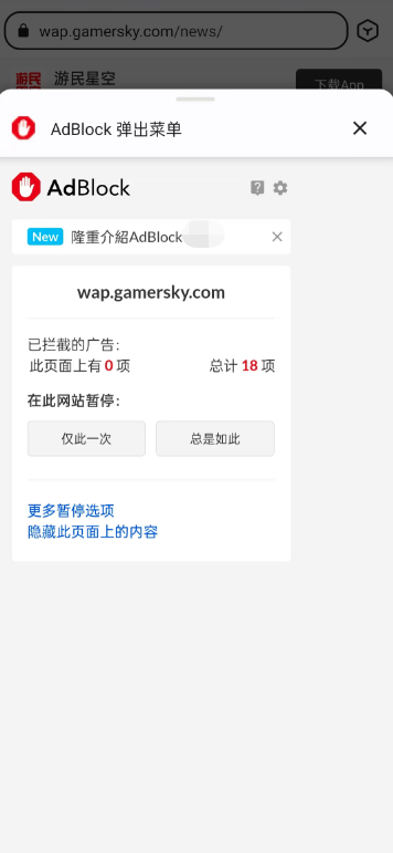 再以Adblock广告拦截插件为例,点击图标后,就能查看当前页面被拦截的广告信息了。
