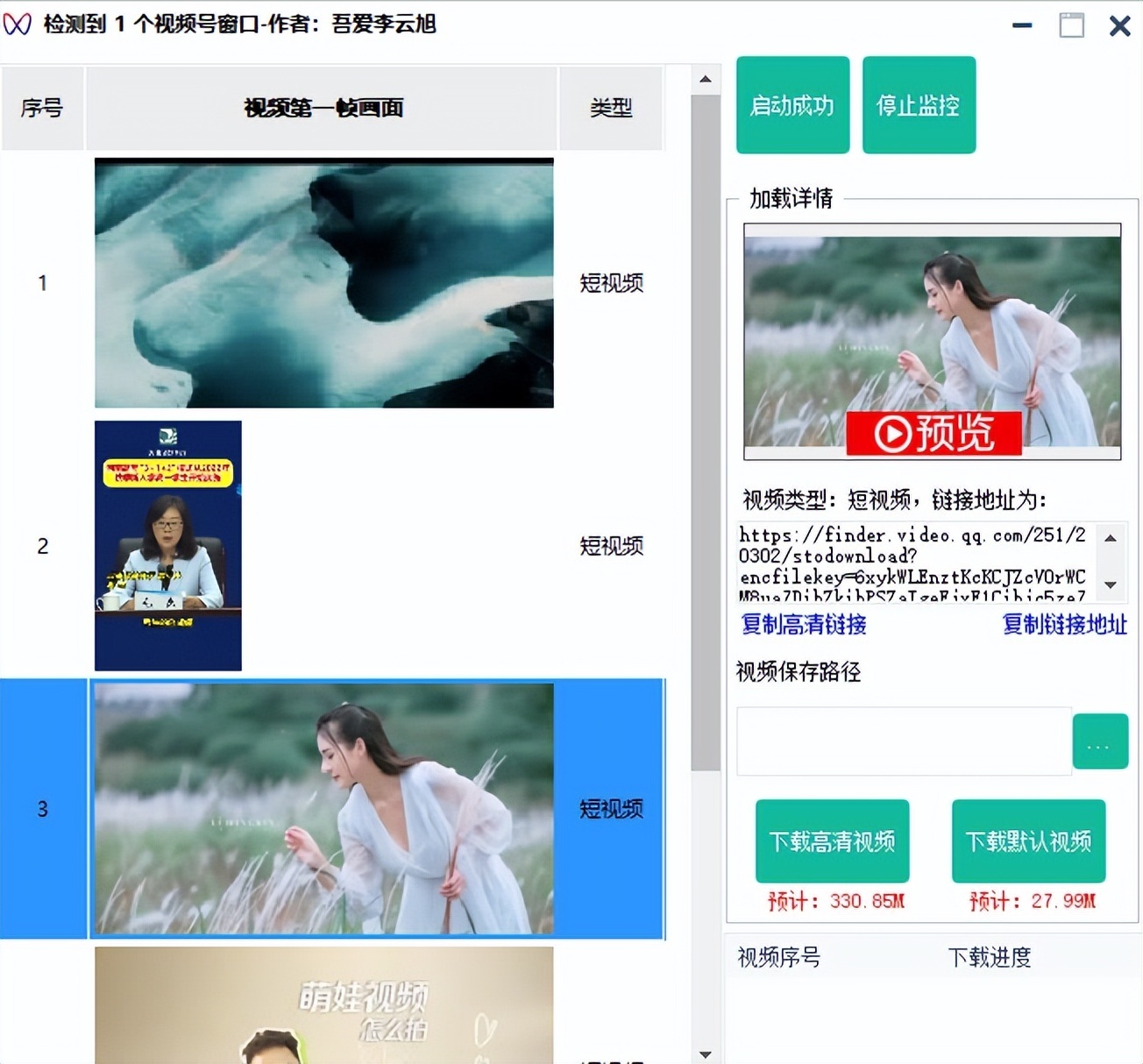 使用方法很简单,打开软件,点击“开始监控” 后,微信客户端打开播放需要下载的视频,软件就会自动嗅探播放地址并加载到列表中。