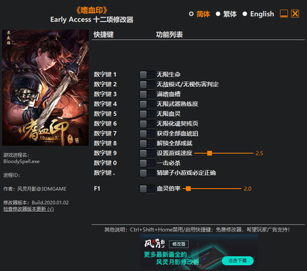 嗜血印修改器最新版是专门用来辅助同名游戏的软件工具,这款软件有着极其强大的功能。我们都知道嗜血印修这款游戏是非常好玩的游戏,但是它也是比较硬核的一款游戏,为了让更多的小伙伴们可以快速上手它,小编今天特意带来了这款工具软件。使用这款软件可以修改游戏的数据,游戏系统,可以让玩家享受无限的生命体力,无限的游戏资源,无限的生命技能,而有了这些玩家就可以无限制的玩耍这款游戏了。