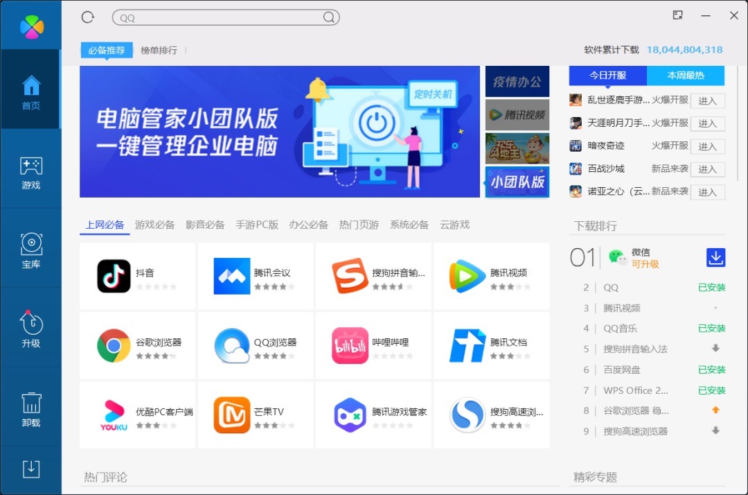 腾讯软件管家是腾讯电脑管家中一个下载和安装软件的组件,它可以帮助用户完成软件下载安装、软件优化、软件卸载等功能,海量的软件宝库提供最安全、纯净的软件下载。