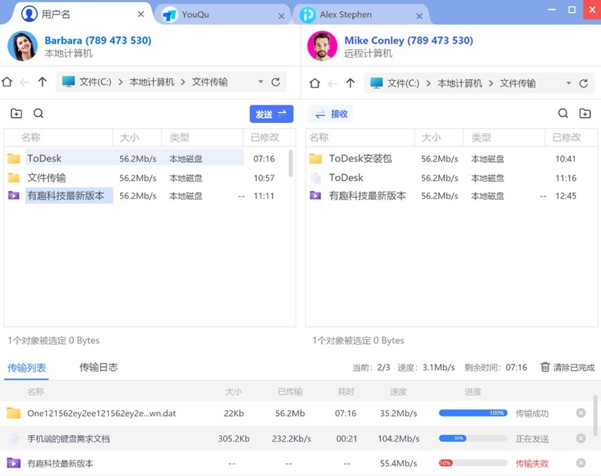 除了用ToDesk和朋友同屏看视频,我还经常用来传输文件。尽管是免费的软件,不过没有限速这种骚操作。只要你自己的网速够快,传文件也是同步网速传输。除了直接拖拽,也可以选择在页面顶端功能栏里点击「文件」,在文件传输窗口进行传输,最高速度可以达到12.0M/s,这点很赞。