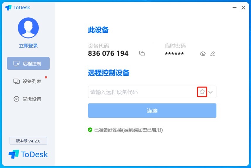 下面是连接页面,界面以标准的蓝色为主,整体视觉统一化很强,设备代码+临时密码可以保护防止自己设备随便被连接,其中临时密码还可修改。如果点击设备的星星图标,就可以绑定连接的设备,下一次免去输入临时密码,直接连接。