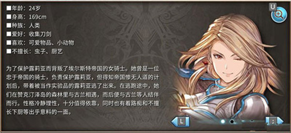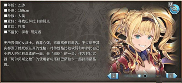 1、隶属于旨在狩猎星晶兽的“组织”的英勇女战士,也是封印武器“阿尔贝斯之枪”的契约者。