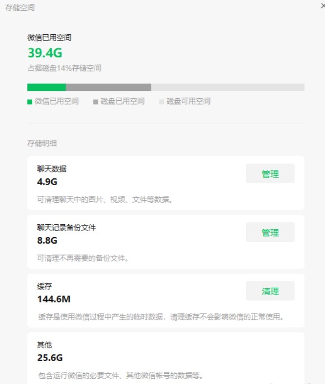 新版 PC 版最大的变化就是带来了“存储空间管理”功能。这个功能让用户可以查看自己的已用存储空间,以及可以对“聊天数据、聊天记录备份文件、缓存”这三大类文件进行清理操作,而占用最多的"其它"这一分类则是无法清理。