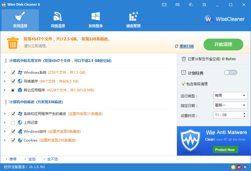 Wise Disk Cleaner 是一款免费的磁盘清理和磁盘碎片整理工具由挖软否发布更新,有效清理系统,应用程序,浏览器的垃圾文件和使用痕迹,并附加磁盘碎片整理工具。可以通过删除临时文件,日志文件,索引文件和备份文件等垃圾文件来释放磁盘空间。删除一些不必要的系统文件,如壁纸,示例视频,示例音乐,Windows帮助,Windows补丁备份及安装文件。对磁盘上零散的文件进行调整,并将同一文件不同位置的数据进行重新排列,提升数据访问速度及整机性能。
