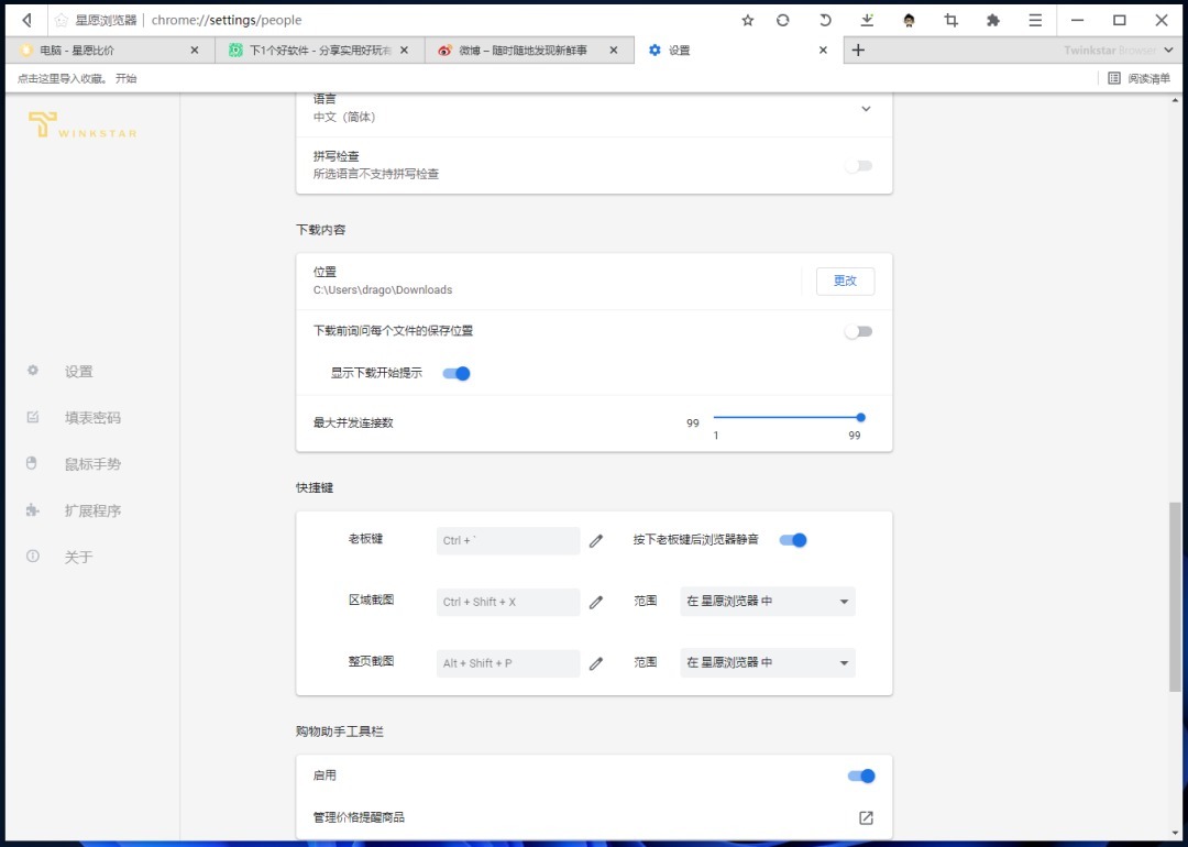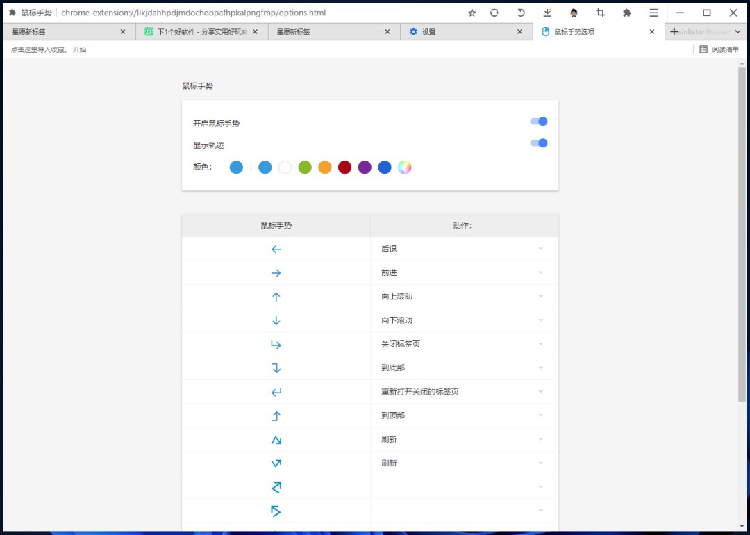 鼠标手势也是必备的功能了,在星愿浏览器里面也自带有了,不用再去安装其它扩展插件来实现,功能支持设定轨迹颜色、手势动作,以及还有支持超级拖拽。