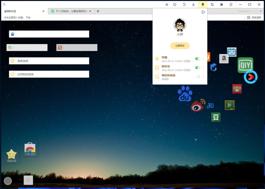 现在星愿浏览器也支持同步功能了,支持 QQ 和微信的登录方式,可以同步书签、标签、密码和表单。