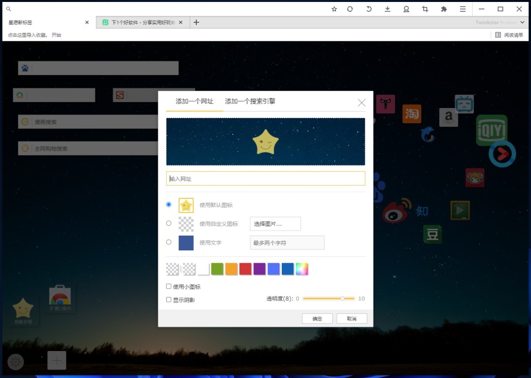 你也可以添加网址或者搜索引擎到起始页,可以自定义设置网址的图标、颜色、图片、透明度、阴影等。