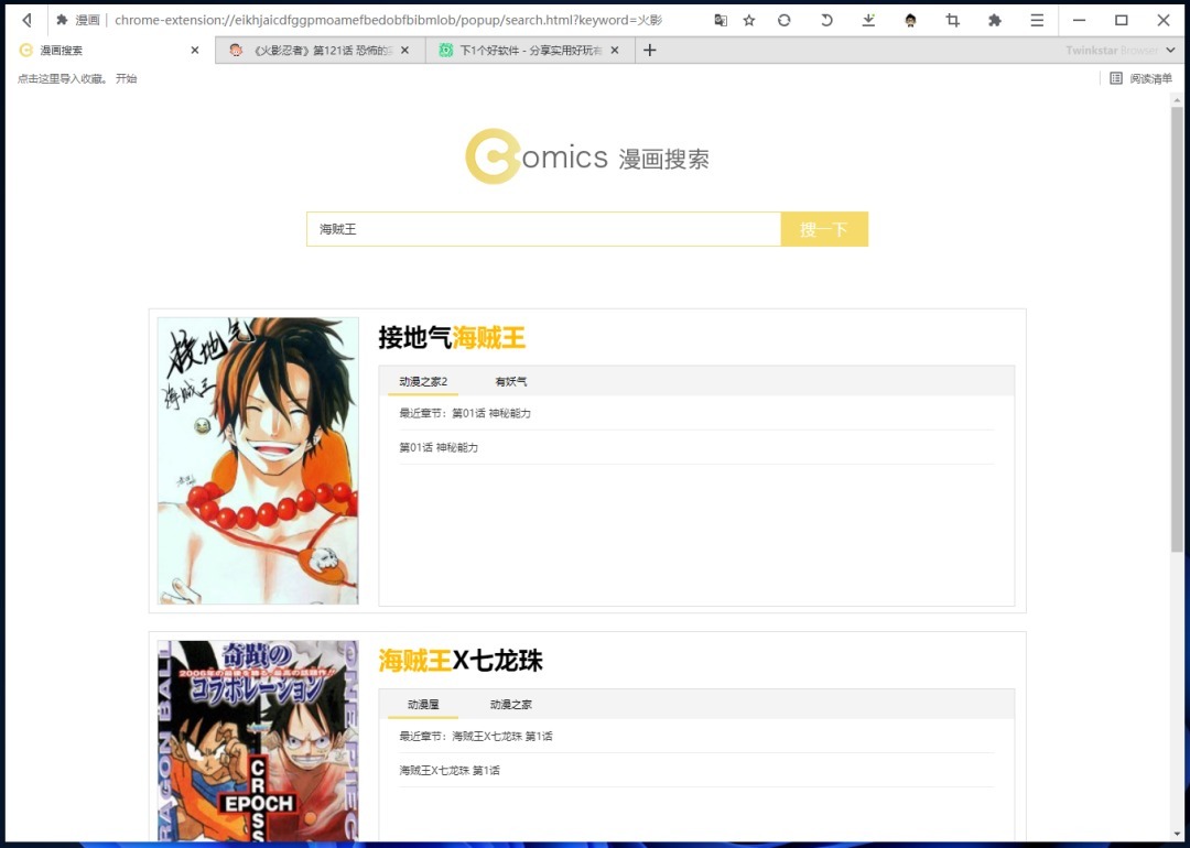 漫画搜索也是这个浏览器主打的特色功能吧,可以搜索漫画和阅读,不过经过测试一些涉及版权问题的漫画也可能搜不到。