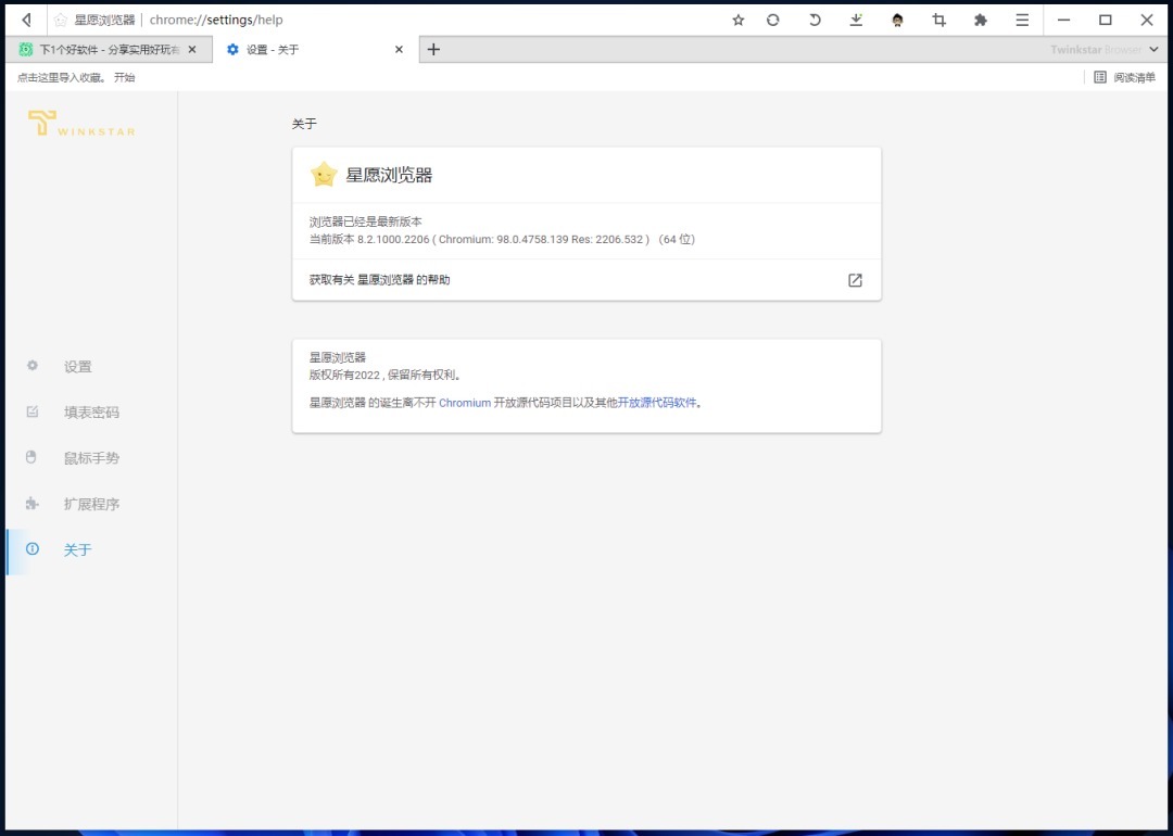 最后当前版本基于 Chromium 98,目前 Chromium 已经更新到了 103 版本,带来更好的性能,希望作者也快快跟进哈哈。