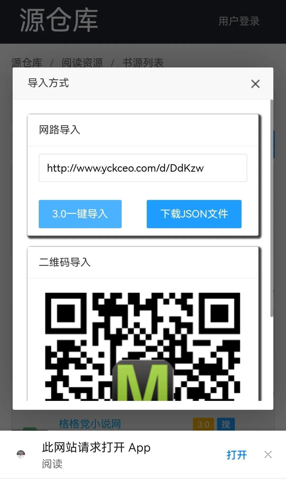 这里为了方便直接使用手机浏览器打开源仓库,点击3.0一键导入,即可跳转阅读App界面,一键导入书源了。